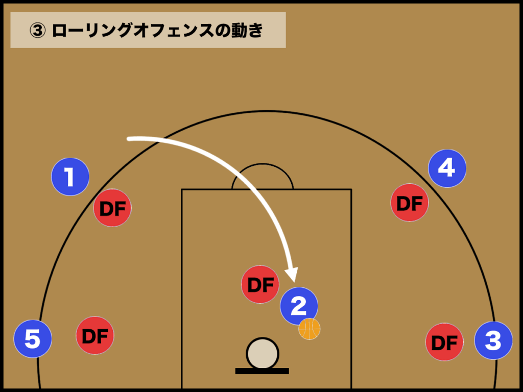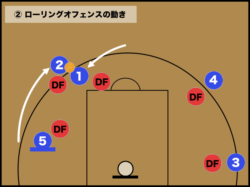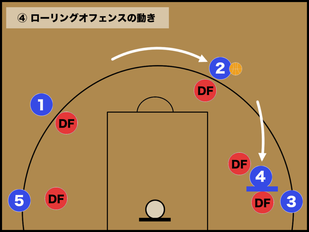 ④ 仮にドライブが狙えない場合、青2はドリブルで反対サイドへと移動し、再びダウンスクリーンからローリングオフェンスを繰り返すのです。