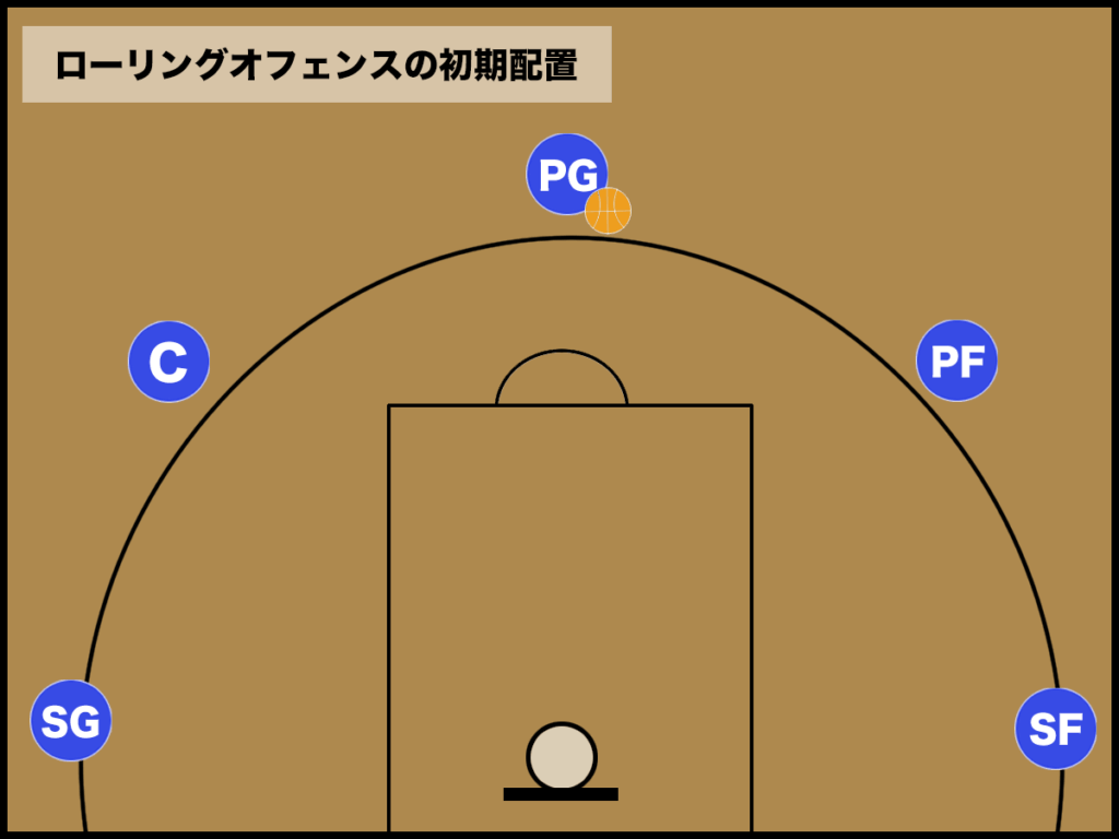 ローリングオフェンスの初期配置は、選手5人全員がアウトサイドに広がる「5アウト」の陣形から始動します。