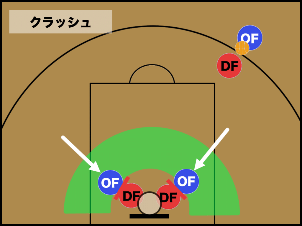 スリー&クラッシュの”クラッシュ“とは、相手のスクリーンアウトを押し込む動作になります。