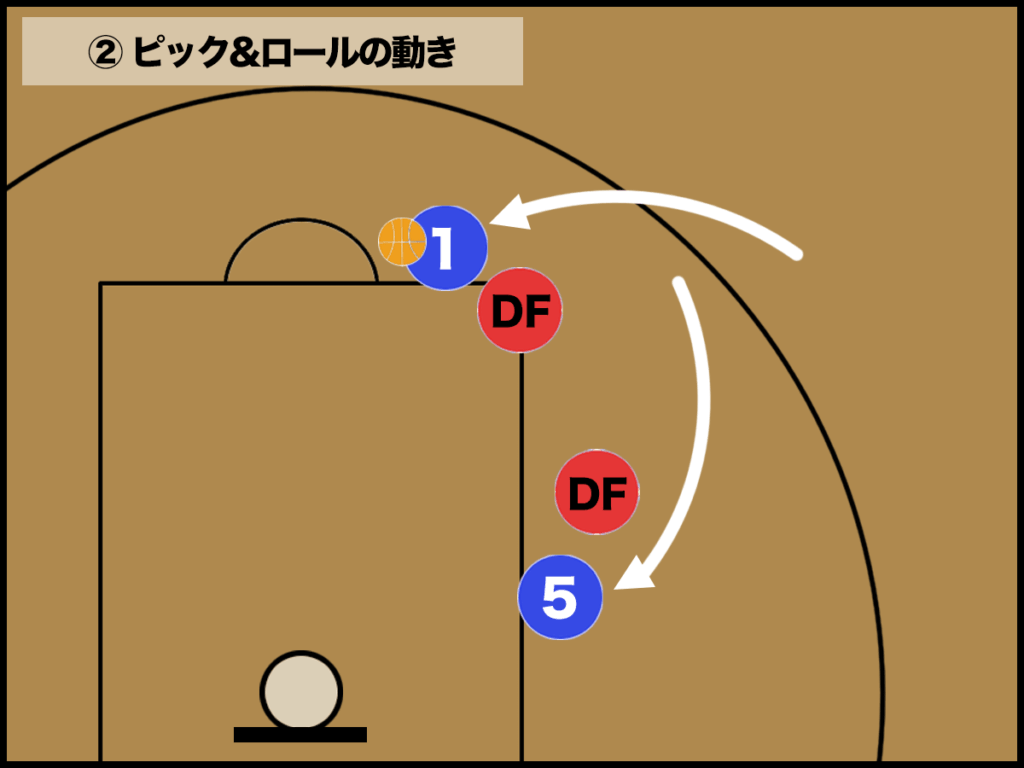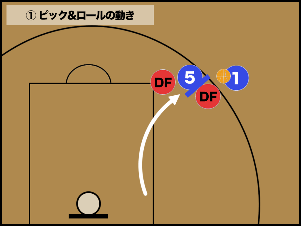 ① ピック&ロールと同様に青5が青1へボールスクリーンを作りにいきます。