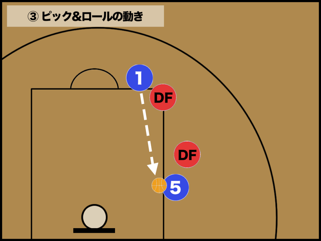 ③ ボールスクリーンから作られたズレを活かし、青1と青5の2対2で得点を狙うのです。