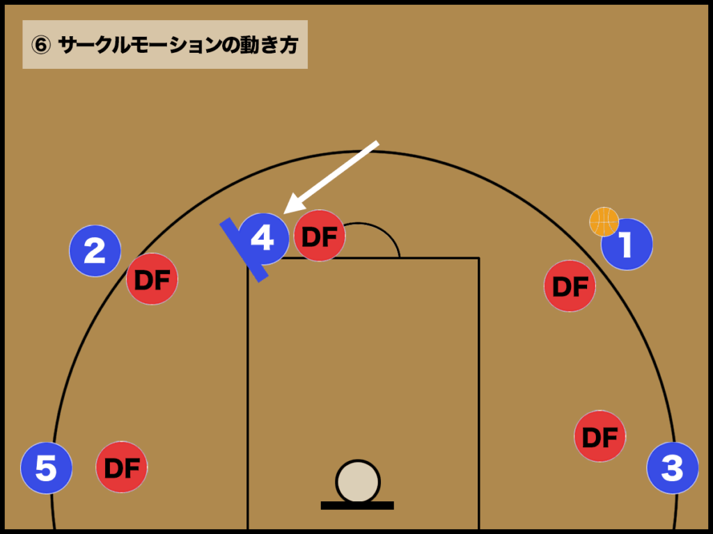 ⑥ 一度の攻撃でディフェンスを崩せない場合、逆サイドでもサークルモーションオフェンスを繰り返しましょう。
