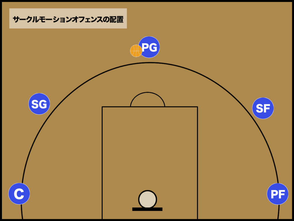 サークルモーションオフェンスは、5人が外角へと広がる「5アウト」から始動します。