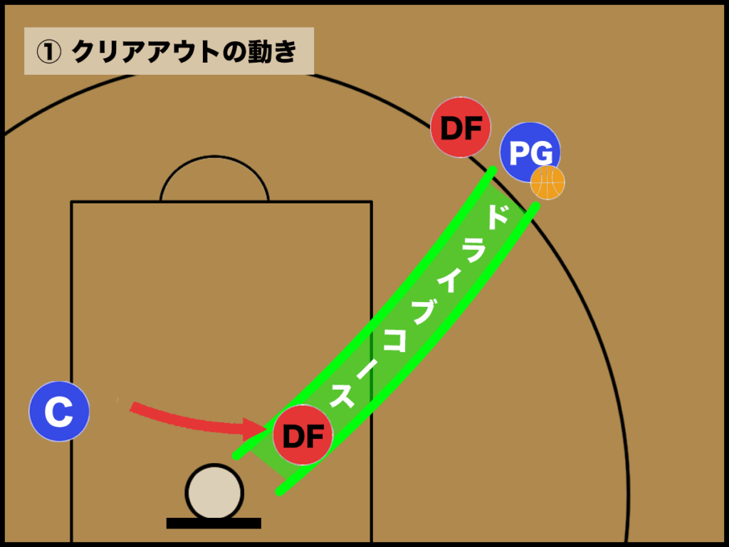 味方のペネトレイトに対して、オフボールの選手がヘルプディフェンスの動きを止める技術を「クリアアウト」と呼びます。