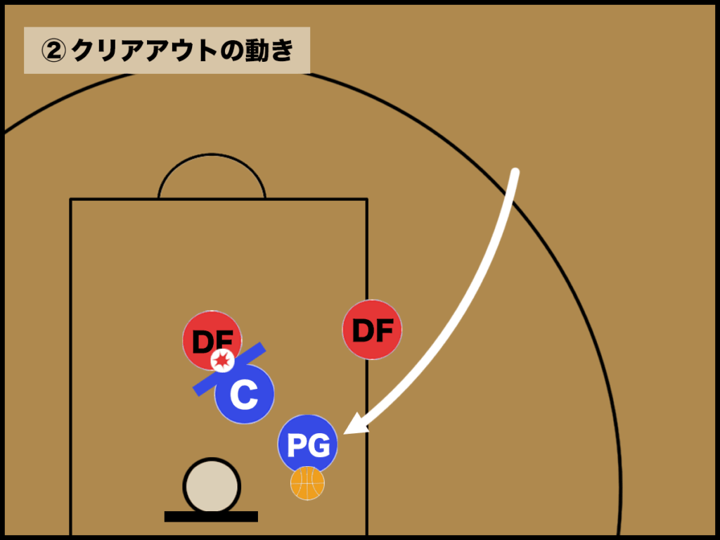 基本的にクリアアウトを行う選手は、ヘルプディフェンスにマッチアップをされているオフボールの選手が役割を担います。