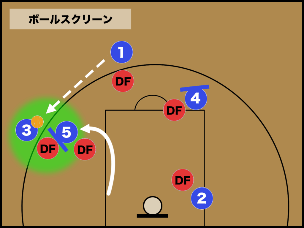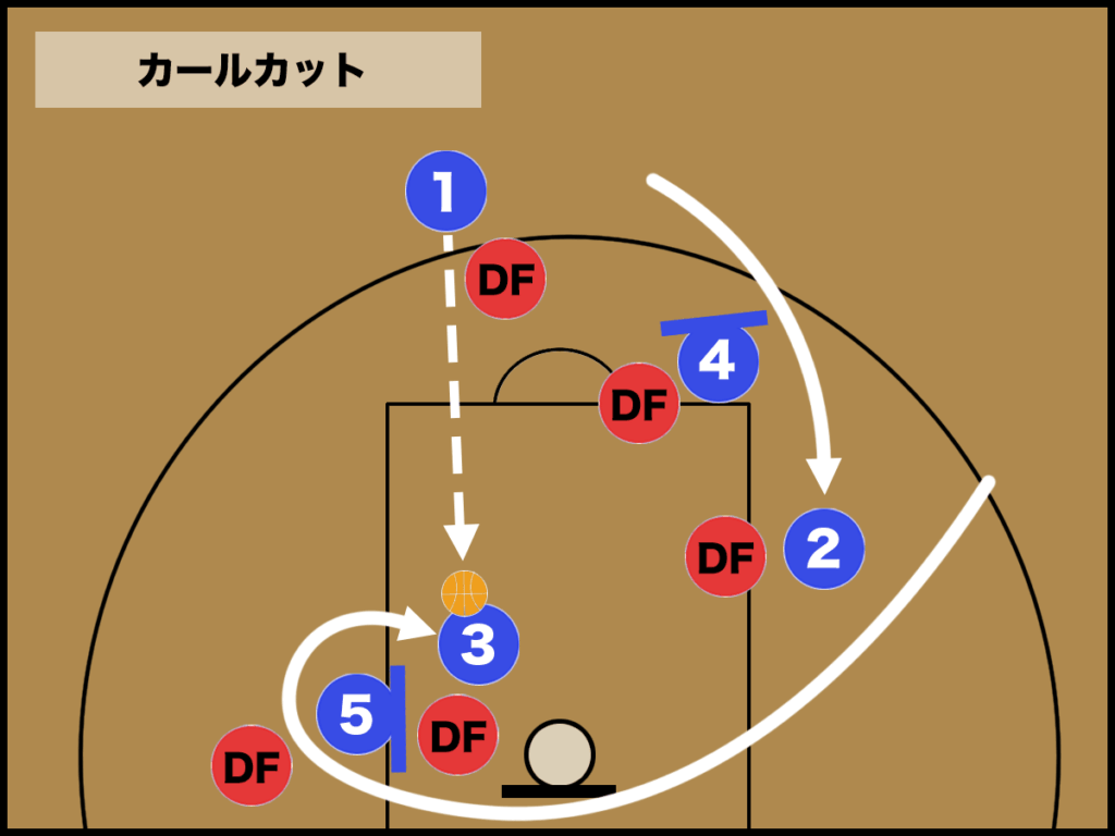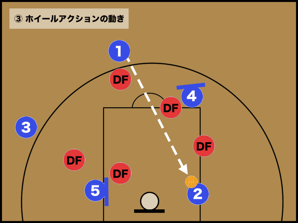 ② 青3はローポストの青5のスクリーン、青2はハイポストの青4のスクリーンを使い、円を描く様に移動します。