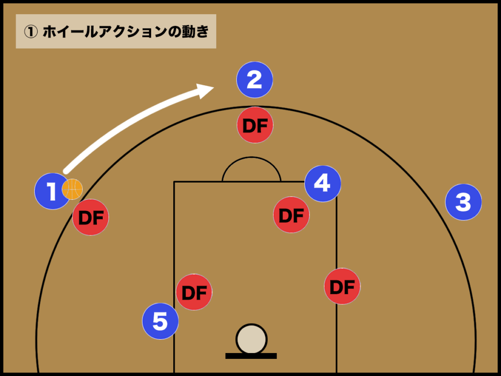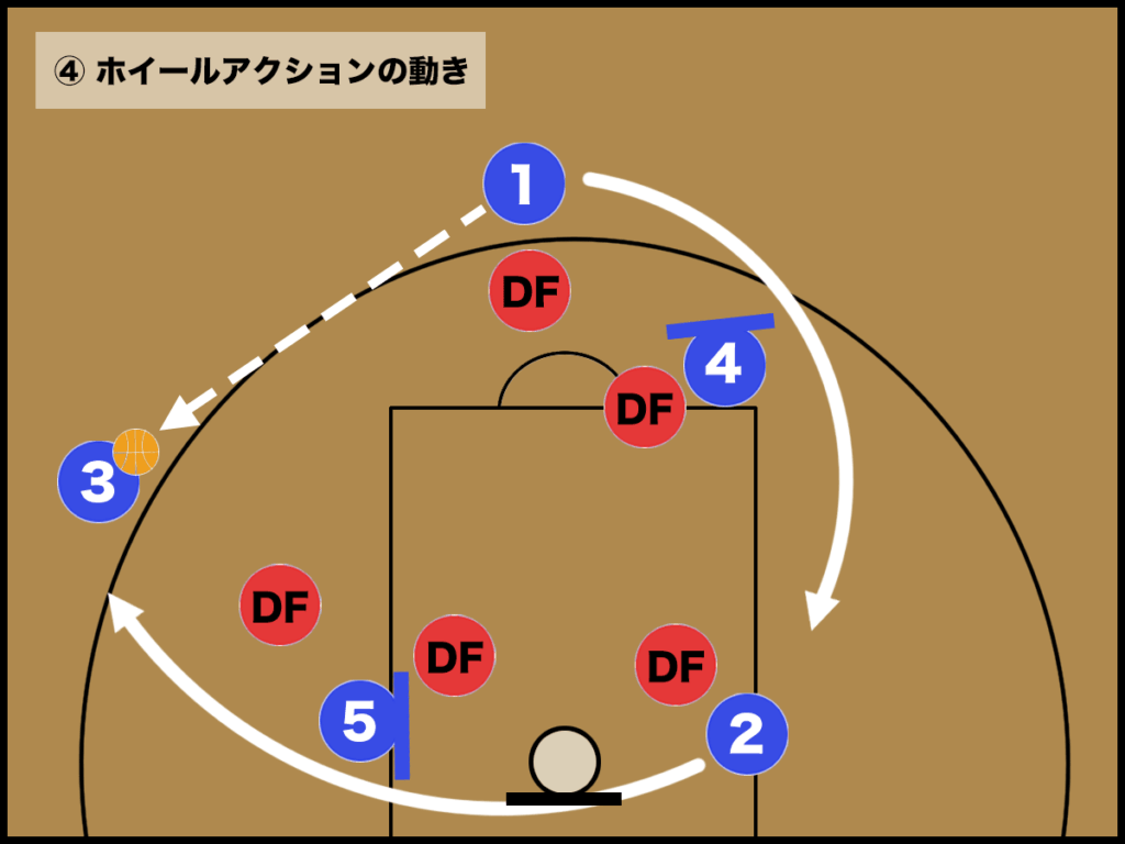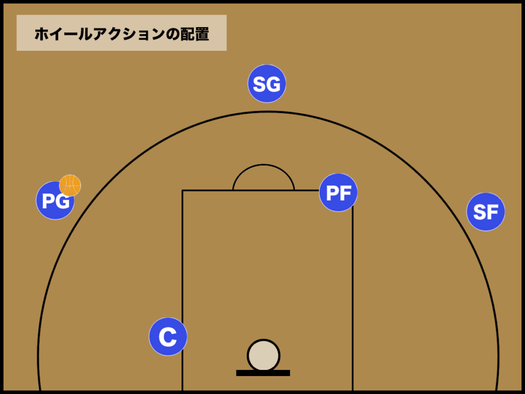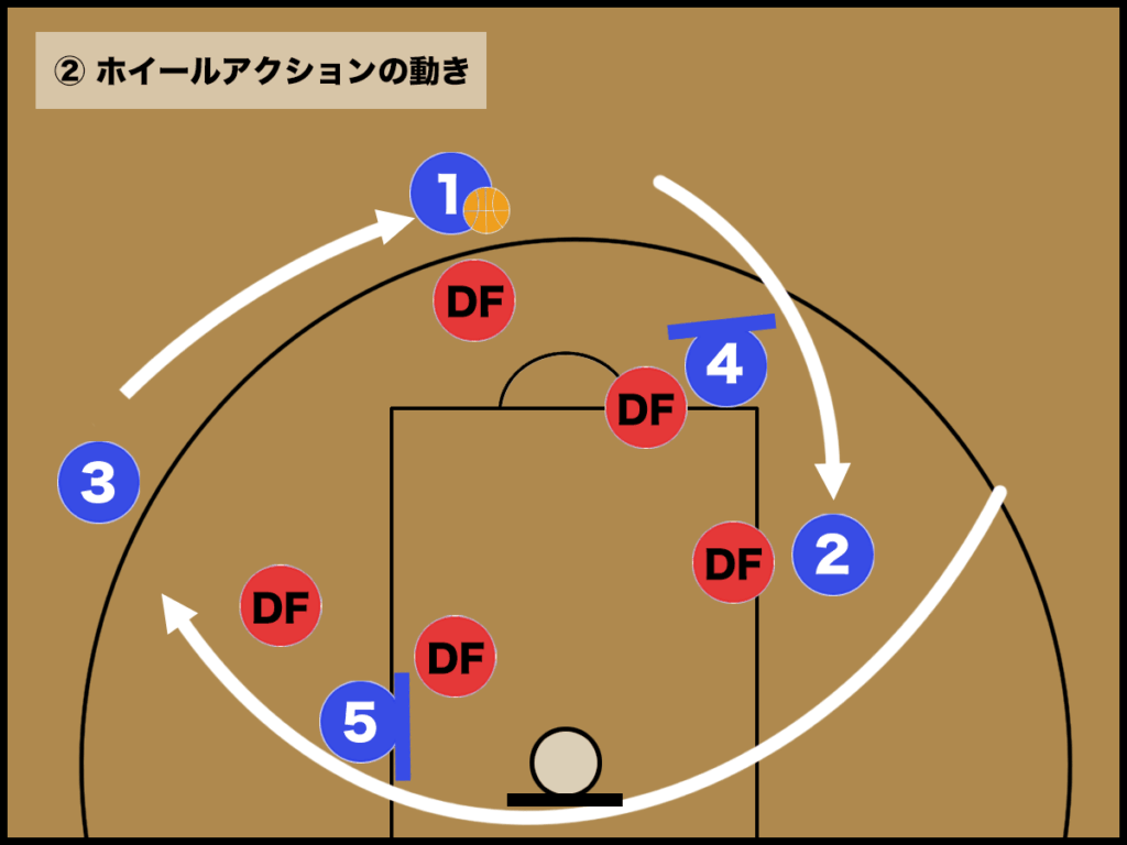2つのスクリーンを中心にオフェンスが”円“を描きながら、得点を狙うフォーメーションが「ホイールアクション」になります。